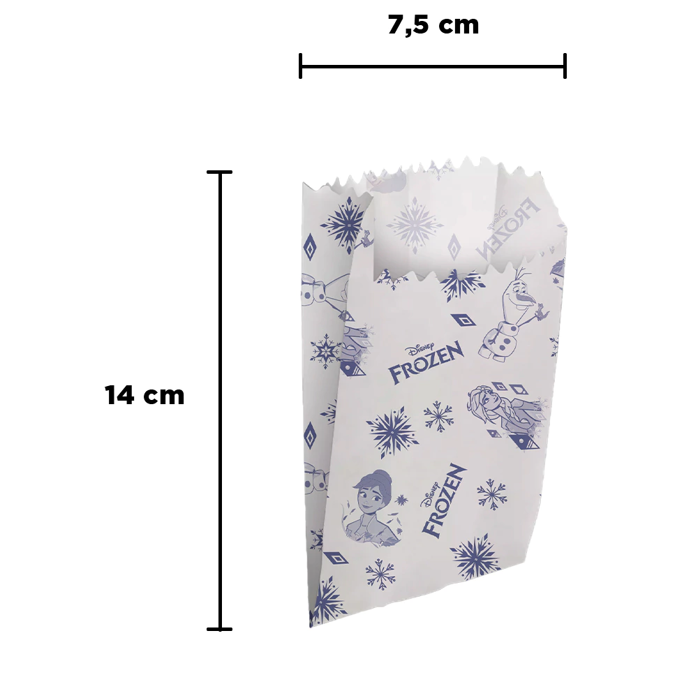 Os Sacos de Papel Frozen da Regina Festas são perfeitos para trazer toda a magia de Arendelle para a festa! Com estampa encantadora das princesas Elsa e Anna, em cores frias e vibrantes, eles são ideais para servir pipoca, lanches, snacks, doces, batatinhas, biscoitos e mini sanduíches, além de funcionarem super bem como lembrancinhas temáticas.