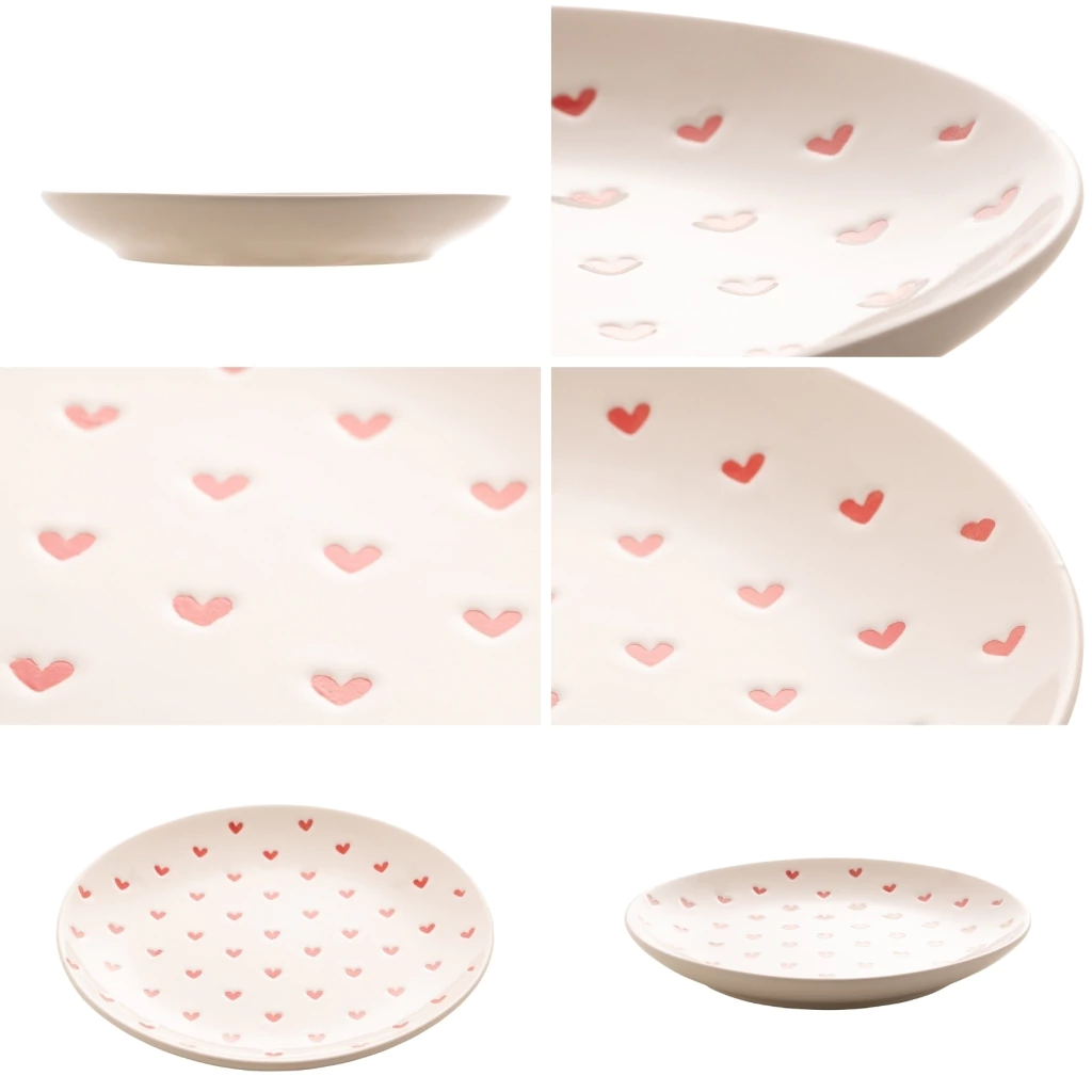 Toque romântico e contemporâneo para sua mesa posta! Cada prato traz mini‑corações em cores suaves — rosa, cinza e preto — perfeito para servir sobremesas, petiscos e encantar seus convidados.