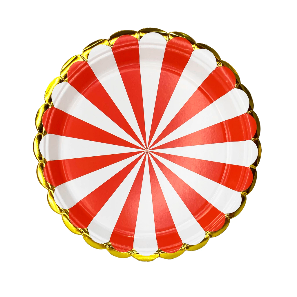 prato papel decorado festa, prato papel circo colorido, prato festa candy color, prato descartável elegante borda dourada, prato festa infantil moderno, prato leque dourado, prato papel tema criativo, prato vermelho amarelo rosa azul festa, prato descartável luxo infantil.